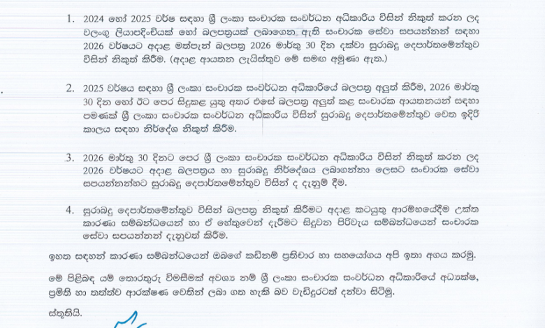 The decision regarding the issuance of excise licenses for the year 2026 is hereby informed as follows: Issuance of Liquor License for 2026 (3) The Excise Department will issue liquor licenses for the year 2026 until 30 March 2026 to tourist service providers who have obtained a valid registration or license issued by the Sri Lanka Tourism Development Authority for the years 2024 or 2025. (The list of relevant institutions is attached herewith.) The renewal…