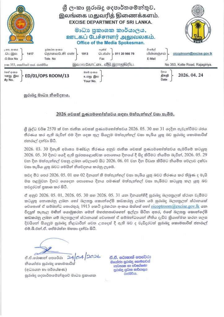 Authorities have also clarified that while an earlier notice mentioned closures on May 1 and 2, liquor shops will now only be required to close on the Poya Day on May 1, along with the Vesak-related restrictions.
